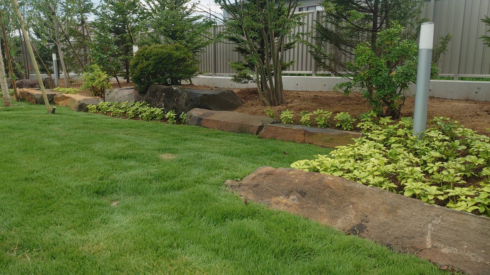 Home 会社案内 工事の流れ 当社の仕事 植鶴<作庭集> Topics 採用情報 お問い合わせ Home 会社案内 工事の流れ 当社の仕事 植鶴<作庭集> Topics 採用情報 お問い合わせ Create 造園工事 Create 造園工事 山形|河北K邸 横使いの六方石と、鳥海石を組み合わせて植栽部の石組みを行い、前面の芝生空間のひろがりを邪魔しない落ち着いた空間としました。 ←山形|鶴岡 S邸 山形|山辺→I邸