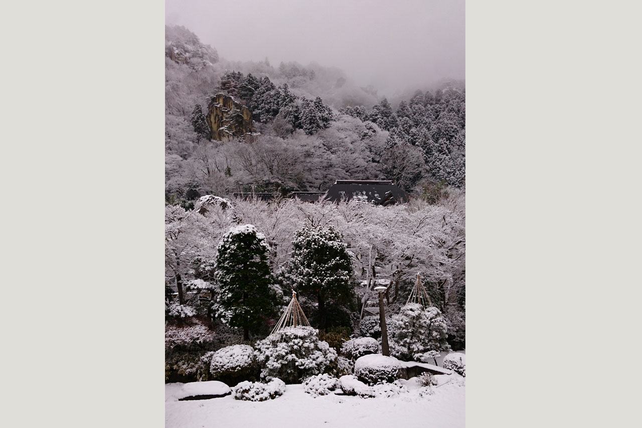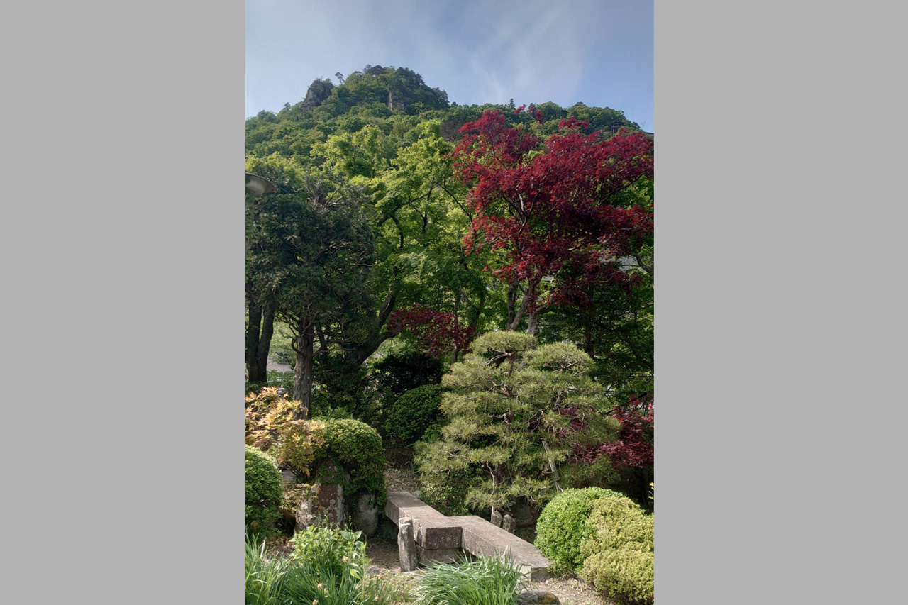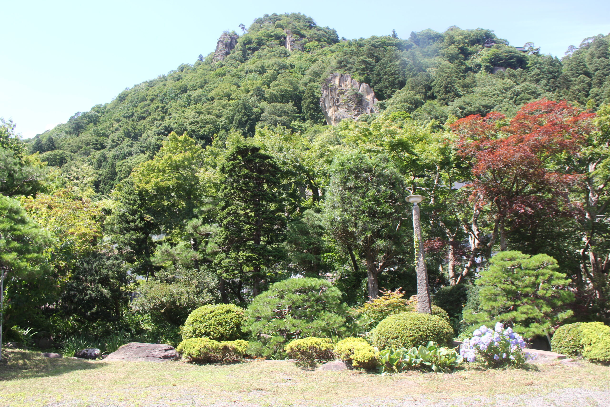 庭園としては、背後の山寺立石寺を借景としたとても素晴らしい立地となっており、木々も山寺を借景へと導くように配されており、山寺らしい景色を楽しむことが出来ます。当社では、閉館後約10年で荒れてしまった庭園を、平成28年(2016)より手入れさせていただいており、この場所が地域の魅力を担う一助となるように努めております。